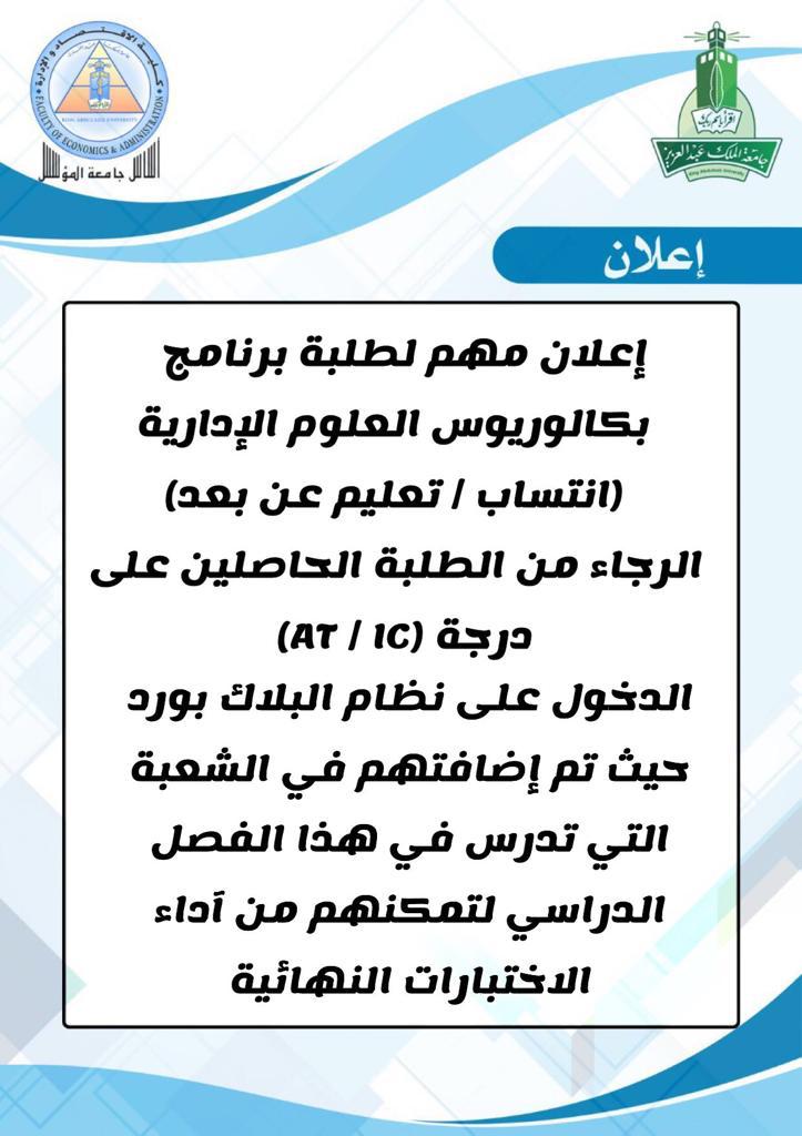 كلية الاقتصاد والإدارة On Twitter تنويه عاجل لطلاب بكالوريوس العلوم الإدارية انتساب تعليم عن بعد