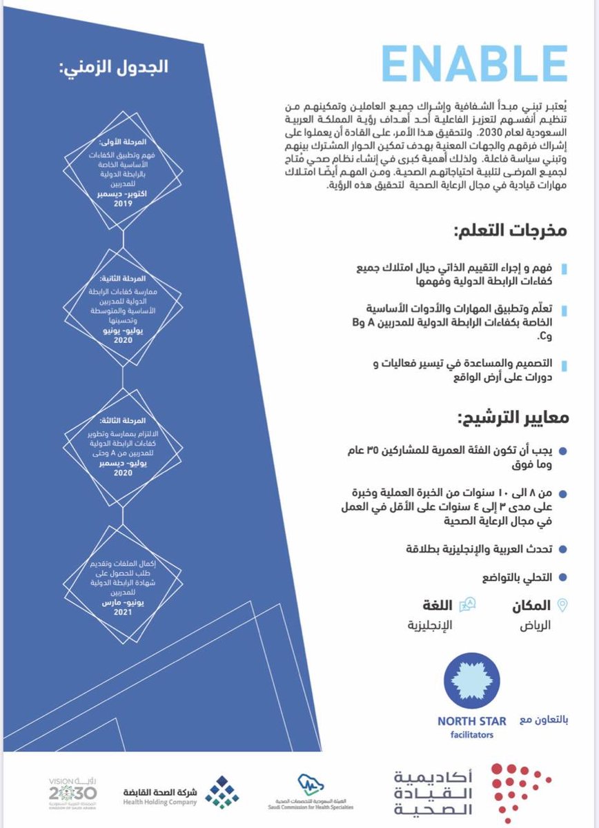 هيئة التخصصات الصحية On Twitter هيئة التخصصات الصحية ممثلة بـ أكاديمية القيادة الصحية تطلق البرنامج التدريبي الخاص بإعداد مدربي القيادة Enable الذي يضم نخبة من ذوي الخبرات في القطاع الصحي تحت إشراف ودعم مشروع شركة الصحة