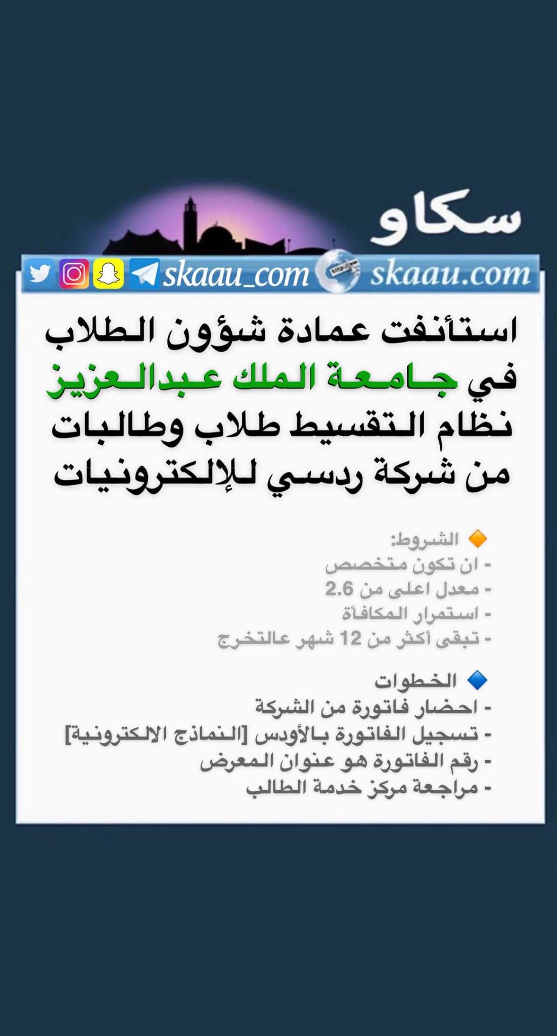 سكاو On Twitter استأنفت عمادة شؤون الطلاب في جامعة الملك عبدالعزيز نظام التقسيط طلاب وطالبات من شركة ردسي للإلكترونيات الشروط والخطوات في الصورة سكاو Https T Co 3hr7iyvzdm