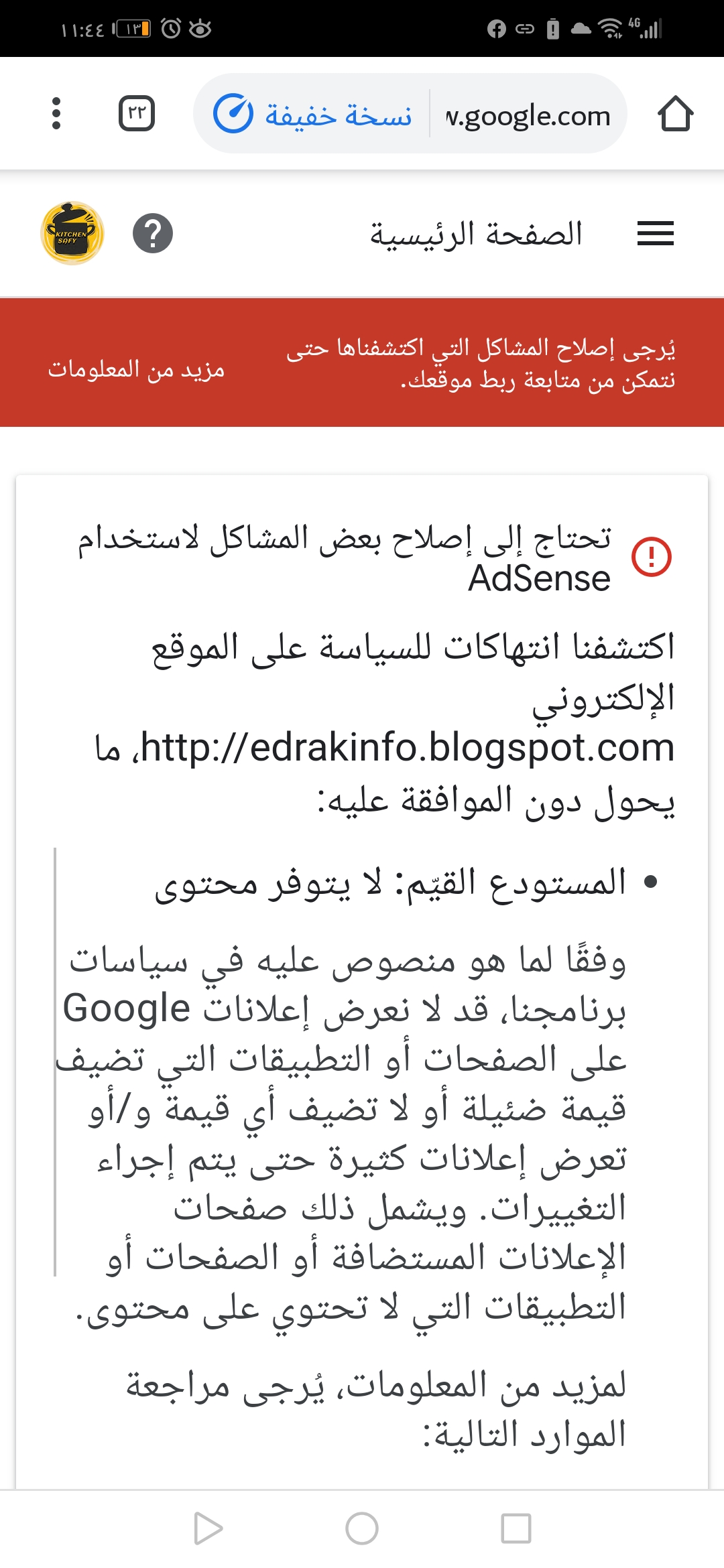 تم مراجعة مدونتي على ادسنس وتم الاجابة بوجود المشكلات التي يجب حلها مثل انتهاك السياسة ولا اعرف حلها Adsense Community