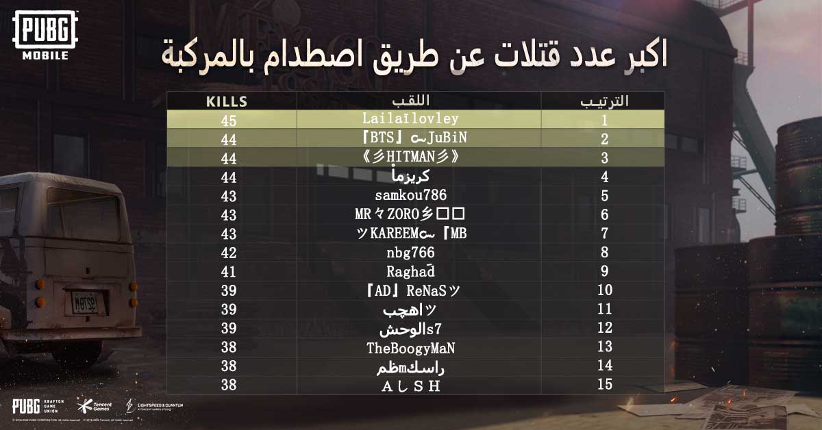 Pubg Mobile Arabic A Twitter قد يكون الأمر مجنون لكن الاصطدام كفيل بالقضاء على أي شخص تعرف على قائمة أكثر 15 لاعب حصلوا على أعلى عدد قتلات عن طريق اصطدام بالمركبة Pubgm