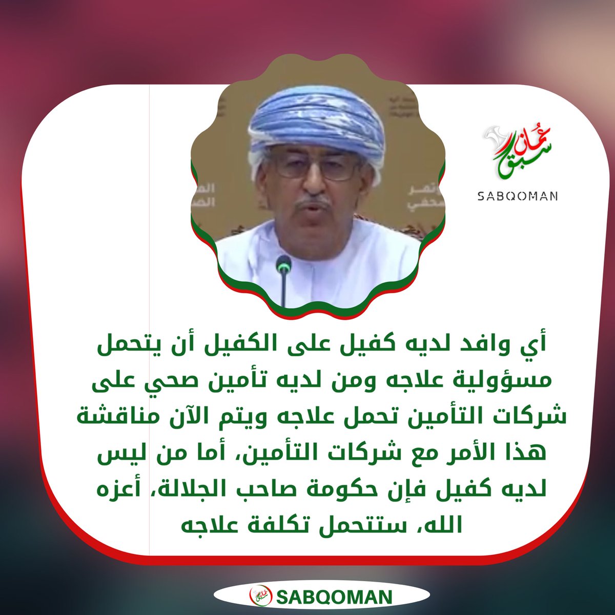 سبق ع مان Sabq على تويتر أي وافد لديه كفيل على الكفيل أن يتحمل مسؤولية علاجه ومن لديه تأمين صحي على شركات التأمين تحمل علاجه ويتم الآن مناقشة هذا الأمر مع شركات