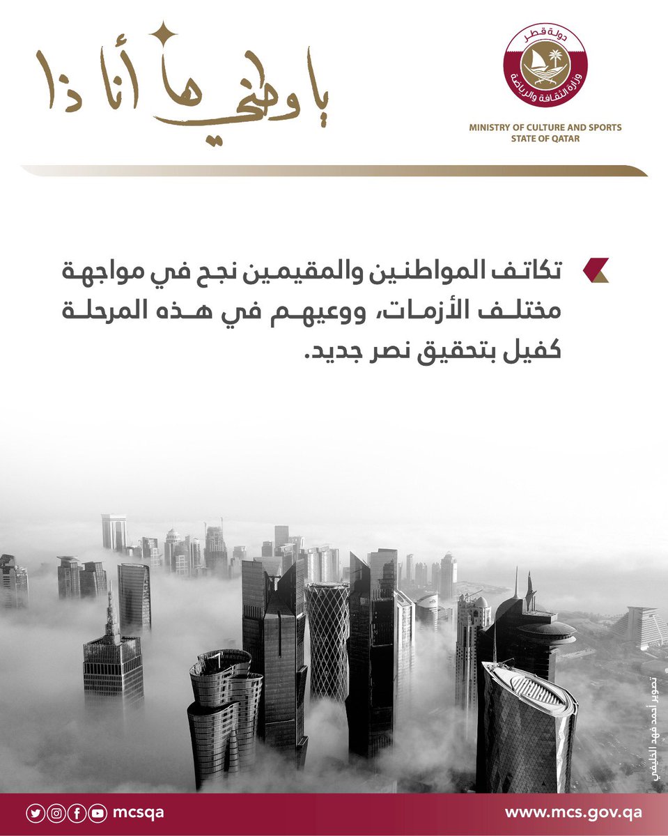 وزارة الثقافة و الرياضة على تويتر تكاتف المواطنين والمقيمين نجح في مواجهة مختلف الأزمات ووعيهم في هذه المرحلة كفيل بتحقيق نصر جديد ياوطني ها أنا ذا سلامتك هي سلامتي الوعي يحمينا Https T Co Ddplr78eqr